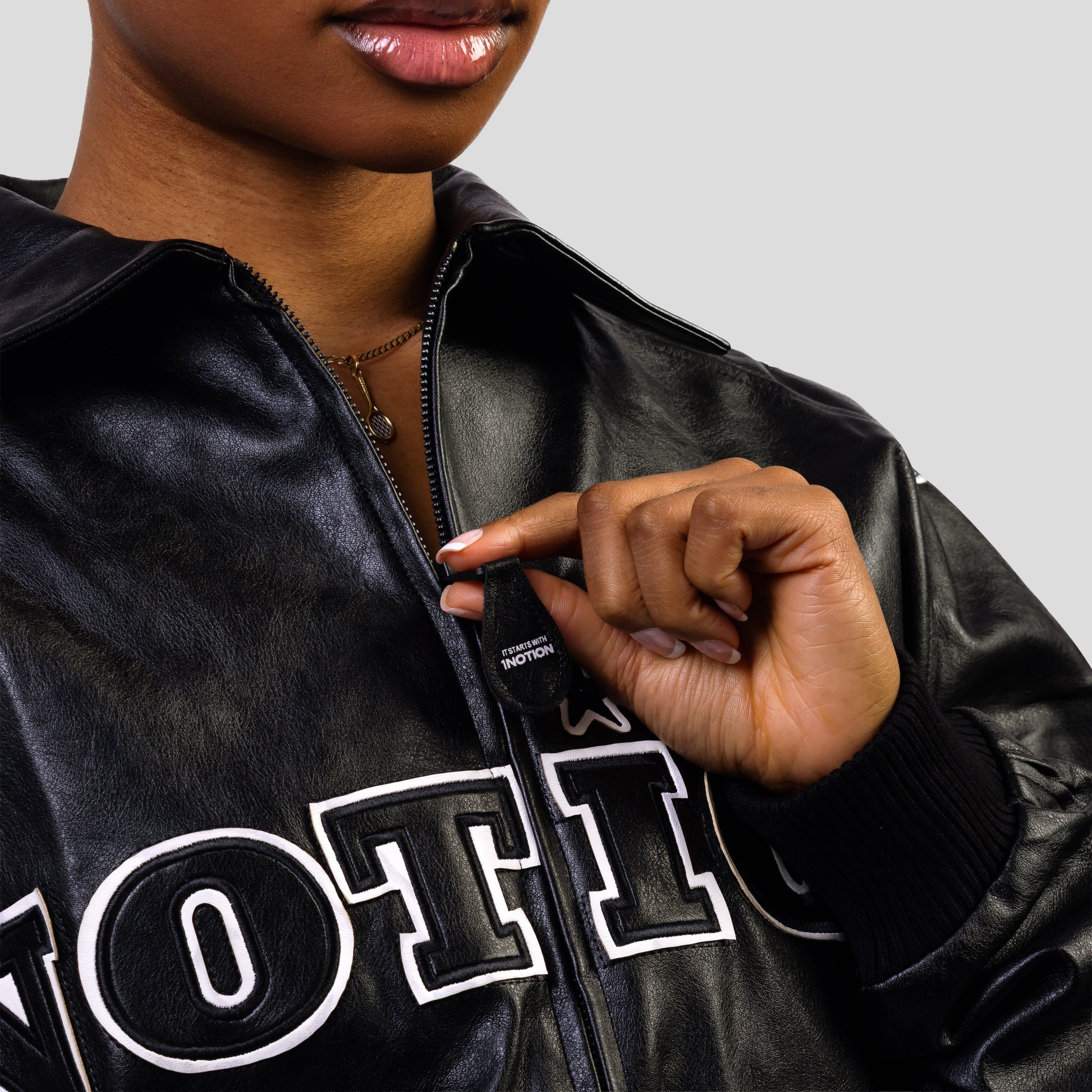 Notion leather jacket in high-grade PU leather. Features the bold NOTION applique across the chest and detailed embroidery on the shoulders, collar and back.